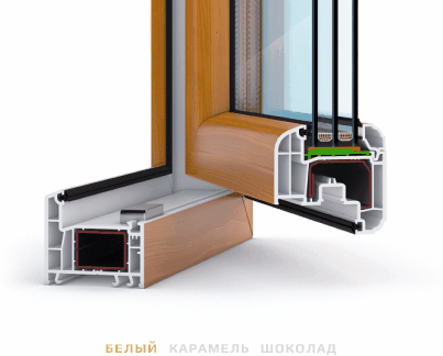 Двустороннее ламинирование плюс добавление пигмента в пластик профиля — торцы окна становятся цветными.
